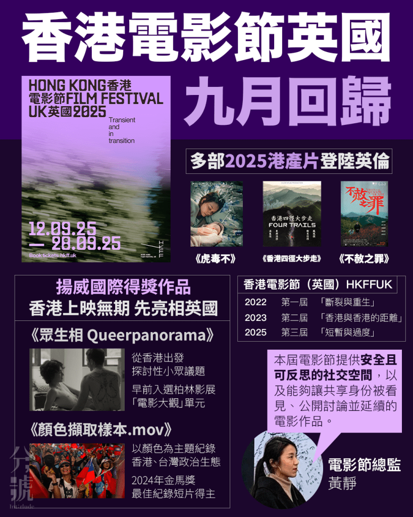 創立於 2022 年的香港電影節(英國)(Hong Kong Film Festival UK,HKFFUK)將於 9 月 12 日至 28 日在倫敦舉行第三屆,並自 10 月起巡迴曼徹斯特、伯明翰及愛丁堡等地。本屆將放映 52 部來自香港及東亞、東南亞(ESEA)散居社群的作品,包括 18 部長片及 34 部短片,其中超過一半由具 ESEA 背景的女性導演執導,題材跨越劇情、紀錄和實驗,探討移民、社會運動、弱勢社群與性別等議題。