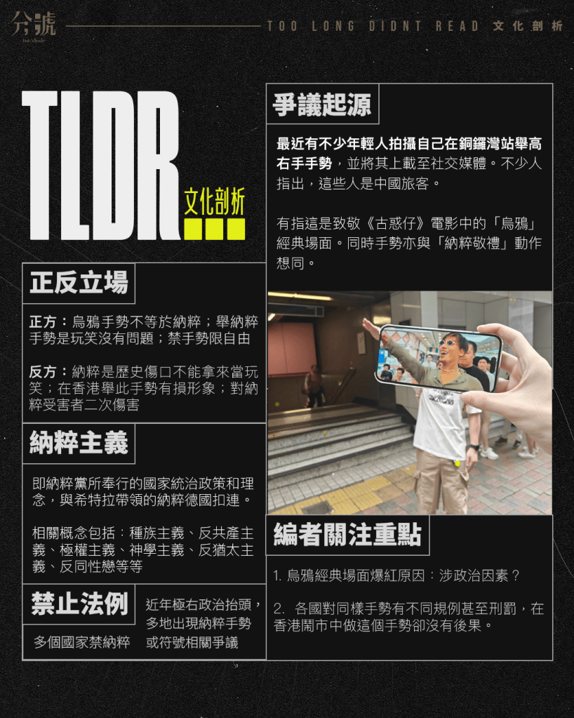 究竟「烏鴉」為何會成為一種獨特的文化符號?「納粹敬禮」為何會成為世人眼中的禁忌?「小紅書」真的有出現這股熱潮嗎?我們又有沒有舉起任何手勢的自由?今期《分號》專欄 TLDR 將與大家深入淺出地解釋「納粹」的含義,並整理「烏鴉」熱潮的前世今生,最後再交由你們來判斷誰是誰非。