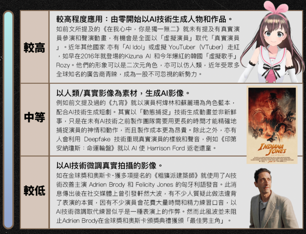 較高程度應用:由零開始以AI技術生成人物和作品。如前文所提及的《在我心中,你是獨一無二》就未有提及有真實演員參演和聲演動畫,有機會是全面以「虛擬演員」取代「真實演員」。近年其他國家 亦有「AI Idol」或虛擬 YouTuber(VTuber)走紅,如早在2016年就登場的Kizuna AI 和今年爆紅的韓國「虛擬歌手」Rozy。他們的形象可以是二次元角色,亦可以仿人類,近年受眾多全球知名的廣告商青睞,成為一股不可忽視的新勢力。