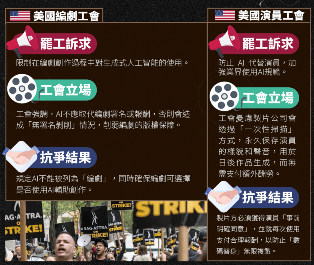 隨著AI技術在影視產業滲透愈深,海外娛樂工會已率先意識到潛在威脅,並透過集體行動爭取保障。2023年起,美國荷里活便先後爆發多場大規模罷工,矛頭直指AI應用對編劇、演員及其他幕後人員的衝擊。